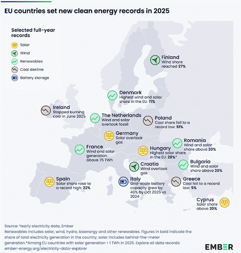 Raportul Ember detaliază faptul că în 2025, Uniunea Europeană a făcut un pas major către un sistem energetic curat, bazat pe energia eoliană și solară. Pentru prima dată, producția de electricitate din surse eoliene și solare a depășit producția din combustibili fosili la nivelul uniunii. Sursele regenerabile au asigurat aproape jumătate din producția totală de energie electrică. Energia solară a atins niveluri record și a funcționat complementar cu energia eoliană, reducând presiunea asupra sistemului în perioadele de consum ridicat.