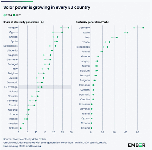Orele cu vânt și soare abundente coincid din ce în ce mai des cu prețuri reduse. În 2025, 19 state membre au înregistrat cel puțin o oră în care energia eoliană și solară au depășit 70% din producția orară de electricitate. În 2020, doar două state au atins acest prag. În Danemarca, Estonia, Germania, Grecia, Lituania, Luxemburg, Țările de Jos, Portugalia și Spania, energia eoliană și solară au furnizat împreună peste 50% din producția de electricitate în cel puțin o treime din orele anului.